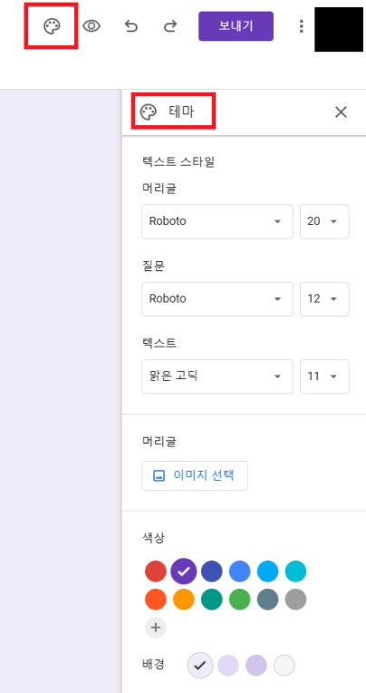 ♦ 빈 양식에 들어간 후, 본격적으로 설문지 제목과, 질문유형, 응답유형을 작성하는 부분이 보입니다. 오른 쪽 상단의 "그림판" 같은 아이콘에 테마라고 보이는데, 이 테마를 클릭하면 아래 부분에 텍스트 글꼴을 수정할 수 있는 부분이 보입니다. 여기서 설문지 제목과, 질문, 응답 등의 글꼴도 모두 다 바꿀 수 있다는 점 참고하시면 좋을 것 같습니다.