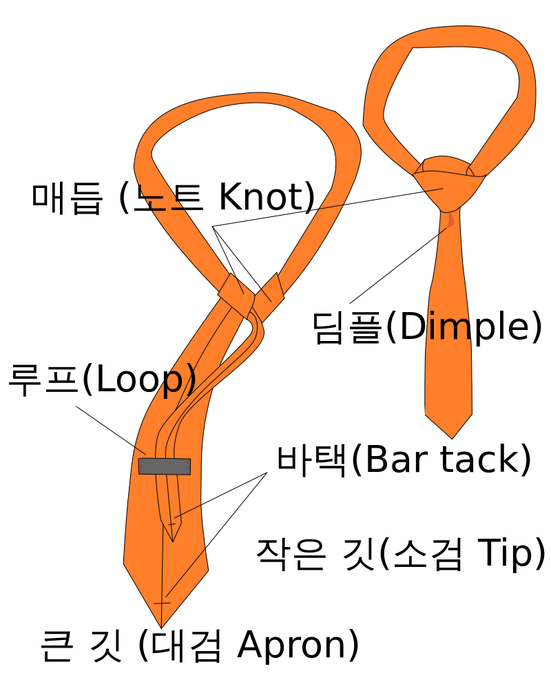 넥타이는 대검, 소검, 딤플, 아치로 구성되어 있습니다. 즉 간단하게 정리해드리자면,