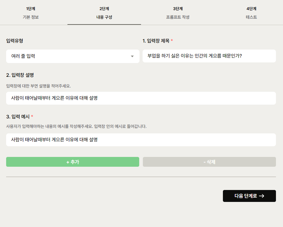♦ 2단계는 해당 툴이 어떤 내용으로 구성되었는지를 작성하는 부분입니다. 저는 테스트로 아래와 같이 작성 하고 다음 단계로 넘어갔습니다.