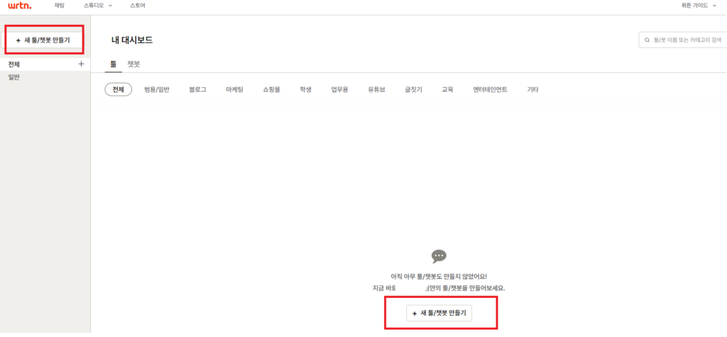 뤼튼 스튜디오에 들어가 보면 여러가지 툴이나 챗봇을 만들 수 있는데요. 뭐 블로그, 마케팅, 쇼핑몰, 학생, 업무용, 유튜브, 글짓기, 교육, 엔터테인먼트 등 여러가지 종류별로 주제로 하여 툴이나 챗봇을 만들 수가 있습니다. 그럼 우선 카테고리에 제한되지 말고, 제가 테스트로 한번 툴을 만들어 보도록 하겠습니다.