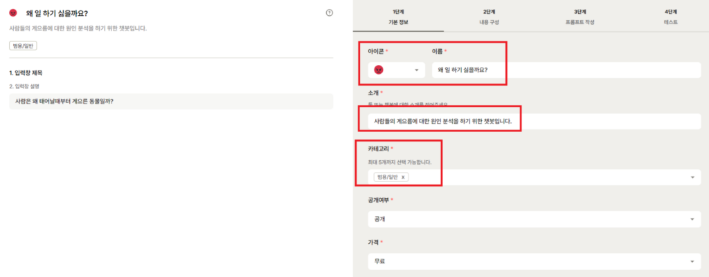 ♦ 1단계인 기본정보를 우선 먼저 입력하시면 됩니다. 여기는 만들려고 하는 툴의 기본 이름과 소개, 그리고 카테고리 등을 소개합니다. 예를 들면 저는 테스트 예시로 "사람의 게으름에 대한 원인분석"을 주제로 한번 툴을 만들려고 시도 해보았습니다.