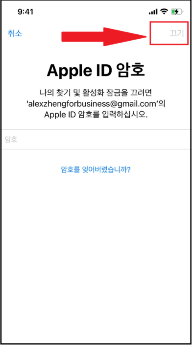 아이폰 암호 클릭 후, 다음, 다음, 계속 다음 진행 하신 다음 마지막 페이지에 와서 (아래 사진 참고) 끄기를 클릭 합니다.