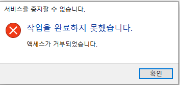 ♦ 중지 클릭하면 "서비스를 중지할 수 없습니다, 엑세스가 거부되었습니다." 라고 나타납니다.
