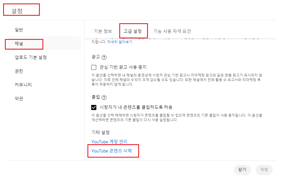 ♦ 아래와 같이 제가 표시한 빨간 색에서 설정 -> 채널 -> 고급 설정 순서로 들어가신 다음, "Youtube" 콘텐츠 삭제를 클릭합니다.