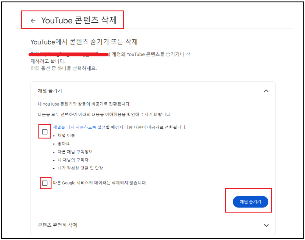 ♦ 그리고 아래와 같이, 채널을 일시적으로 숨김니다. 한글을 아시는 분들? 은 아실텐데 콘텐츠 완전 삭제를 절대!!! 클릭해서는 안됩니다. 체크를 해야 하는 빨간 부분도 , 꼭 체크를 하시고 "채널 숨기기"를 클릭 합니다. 유튜브 채널을 완전히 이세상에서 지우고 싶다 , 고 하시는 분들은 콘텐츠 완전 삭제를 하셔도 됩니다.