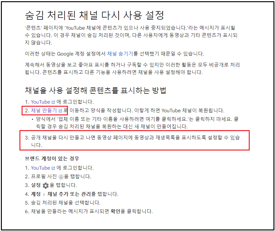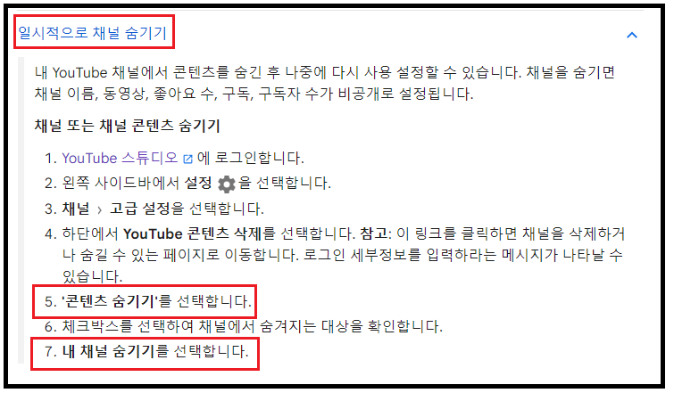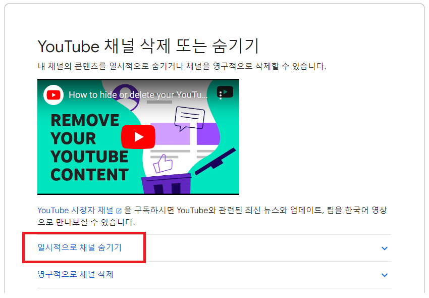 ♦ YouTube 채널 삭제 또는 숨기기 - YouTube 고객센터 에 클릭해서 들아가신 후 "일시적으로 채널 숨기기"를 클릭합니다.