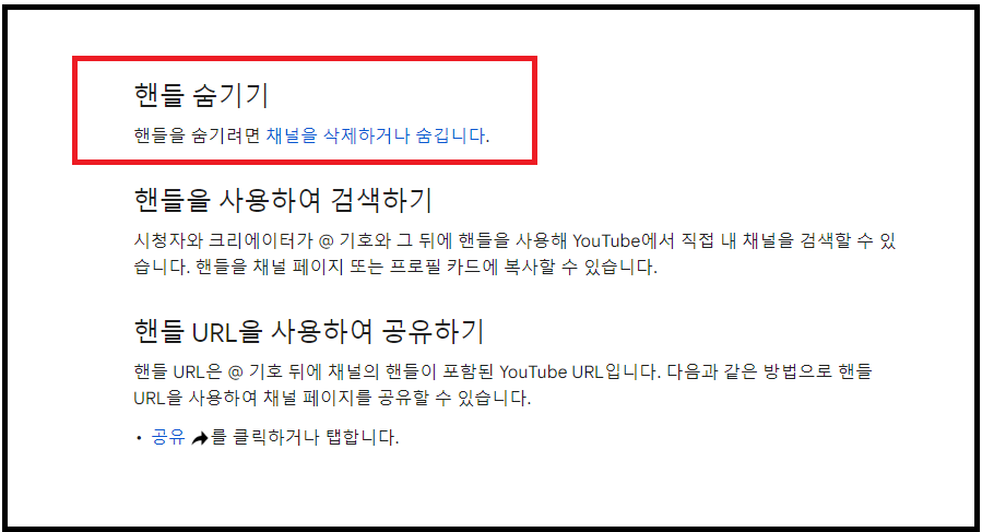 위 링크 클릭해서 들어가 보시면, 핸들 숨기기 부분이 보이실텐데요. 간단하게 말씀 드리면, "너 유튜브 핸들 끄고 싶으면, 채널까지 숨겨야 한다" 라는 구글의 메시지입니다. 즉, 구글에서는 핸들을 중시하고 있고, 이런 솔루션을 활발하게 사용자들이 사용하게끔 하고 있다는 거겠죠.