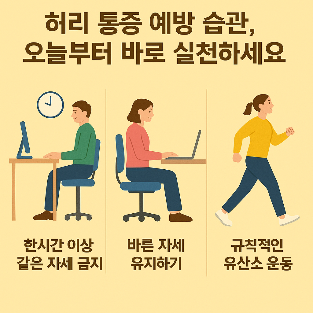 허리 건강을 지키기 위한 최고의 방법은 '예방'입니다. 평소 생활 습관을 바르게 유지하는 것만으로도 많은 허리 질환을 미리 막을 수 있습니다. 무심코 지나치는 작은 습관들이 쌓이면 허리에 큰 부담을 줄 수 있다는 점, 꼭 기억하세요.