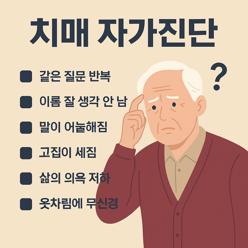 치매는 조기에 발견할수록 치료 효과가 크기 때문에 자가진단이 매우 중요합니다. 자가진단 항목으로는 같은 질문을 반복하거나 이름이 잘 생각나지 않는 경우, 말이 어눌해지거나 고집이 세지는 경우 등이 있습니다. 이 외에도 삶의 의욕 저하, 젓가락질의 어려움, 옷차림에 무신경해지는 변화 등도 주의 깊게 살펴야 할 증상입니다.
