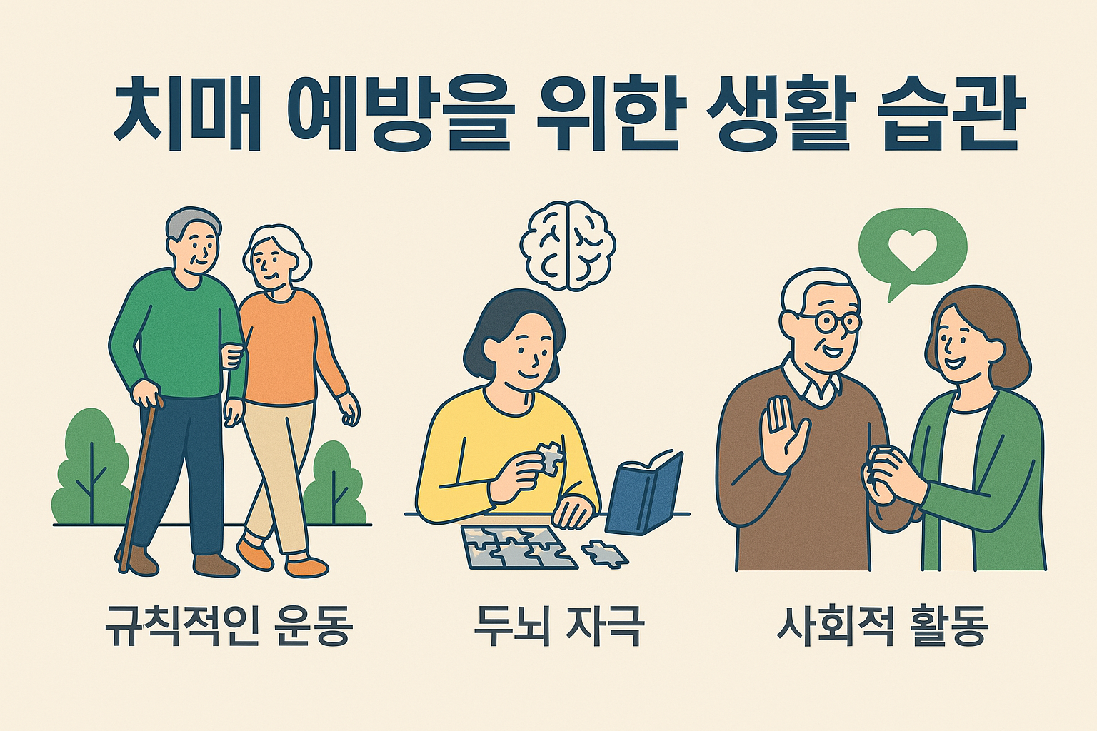 걷기나 가벼운 유산소 운동은 뇌의 혈류를 개선하고 인지 기능을 유지하는 데 효과적입니다. 독서나 퍼즐 맞추기, 악기 연주 같은 활동도 뇌를 자극해 치매 예방에 도움이 됩니다.