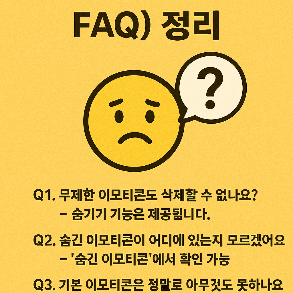 숨김 기능은 삭제는 아니지만, 심플한 이모티콘 목록 관리를 가능하게 해줍니다.