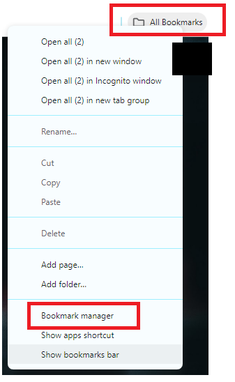 아래 사진에서 보이는 것처럼, "All Bookmarks"를 오른쪽 마우스 우 클릭 후 아래 Bookmark manager를 클릭합니다.