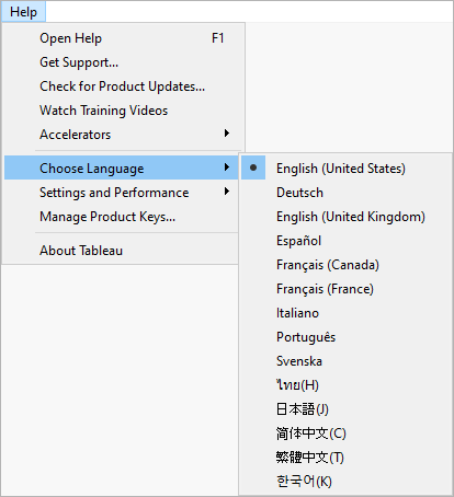 태블로 퍼블릭 설치 후 Help 부분에서 위와 같이 Choose Language 누른 후 "한국어"를 선택하시면 됩니다.