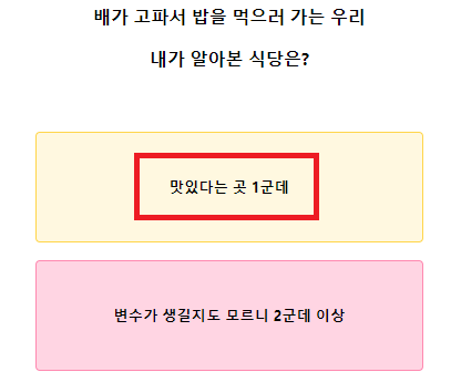 이 문제를 봤을땐, 뭐 식당 1개 선택하든, 2개 알아보든 상관은 없지만, 굳이 배가 고픈데 맛있는데 한곳에 그냥 가서 바로 먹는게 나은 편 아님? 그래서 저는 1번 "좋아 재밌겠다 추억이 될 듯"을 선택합니다. 귀찮은게 젤 싫음.