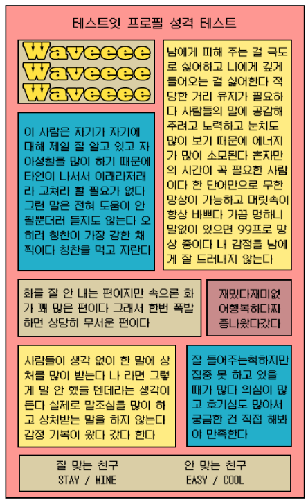 요즘 MBTI를 모르는 사람이 없을 텐데요. 저는 개인적으로 MBTI로 친구끼리 만나면서, 새로운 친구도 만날때, 성격테스트 주제로 수다를 떨면 너무 재미있더라구요. 제가 하루는 , 하루종일 수다떨고 집에 온 후 , 심심할때 한번 테스트잇 프로필 성격 테스트를 해봤는데요. MBTI테스트보다 테스트잇 프로필 성격 테스트 장점은 우선, 시간이 그렇게 오래 걸리진 않고, 결과가 되게 만족스럽다는 겁니다. 제가 테스트잇 프로필 성격 테스트를 해봤는데요, 선택사항을 고르고 결과를 봤는데, 정확하더라구요, 넘 재밌었습니다.