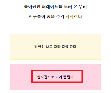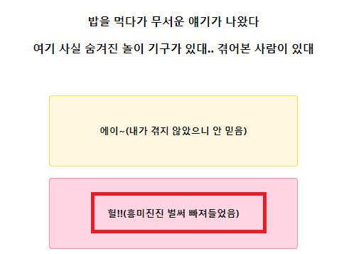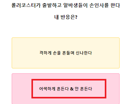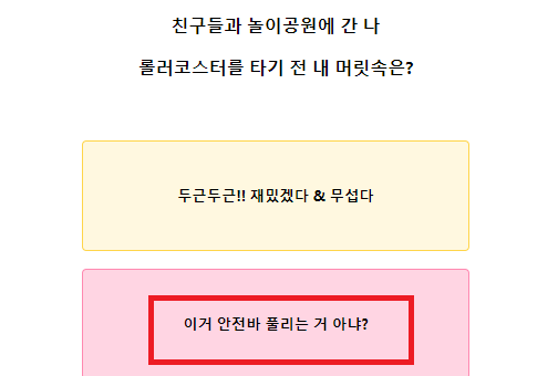 저는 "안전바 풀리는 거 아님?"을 선택했습니다. 주로 이런 스릴 같은거를 잘 못 즐기는 타입이여서요. ㅎㅎ 절대 두근두근 하지는 않습니다. ㅋㅋㅋ