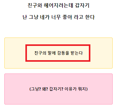 조금 감동인데? ,그냥 이유없이 같이 있는게 재밌고 좋다고 하니 감동을 받는 편.. 솔직히 2번은 뭔가, 너무 정없는 생각인것 같아서 1번 선택함.