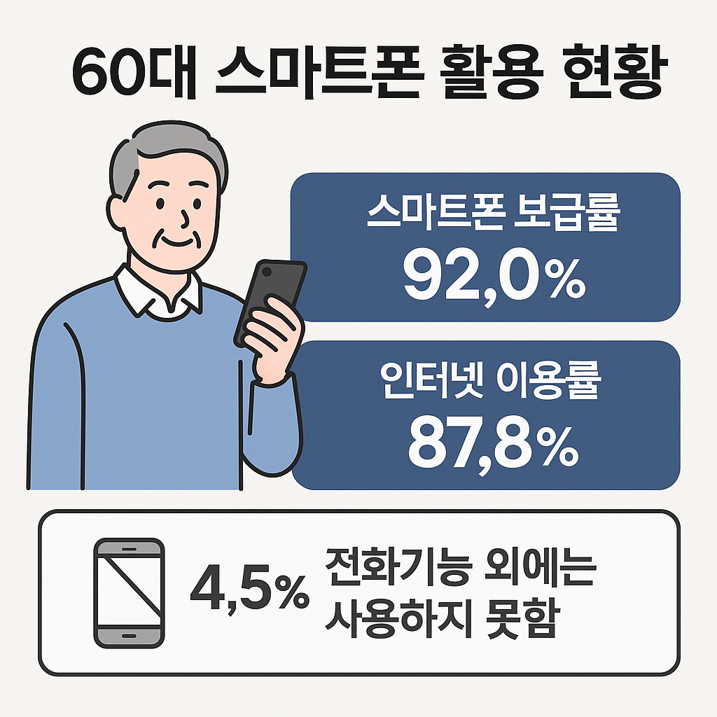 우리 사회는 점차 고령화되고 있으며, 디지털 환경에 대한 적응 여부가 시니어 세대의 삶의 질을 좌우하는 중요한 요소가 되고 있습니다. 특히 60대는 디지털 전환의 과도기를 겪고 있는 세대로, 그들의 온라인 활동은 시니어라이프비즈니스의 핵심 타깃이 되고 있습니다. 이번 글에서는 60대 어르신들 스마트폰 활용 현황을 바탕으로, 이들이 어떤 방식으로 인터넷과 콘텐츠를 소비하고 있는지 살펴보고자 합니다. 60대 어르신들 스마트폰 활용 현황을 통해 단순한 기기 사용을 넘어, 어떤 디지털 서비스가 필요하고 효과적인지에 대한 시사점을 도출해 볼 수 있습니다. 더불어, 60대 어르신들 스마트폰 활용 현황은 세대별 맞춤형 콘텐츠 기획 및 비즈니스 전략 수립에 매우 중요한 기준점이 됩니다.