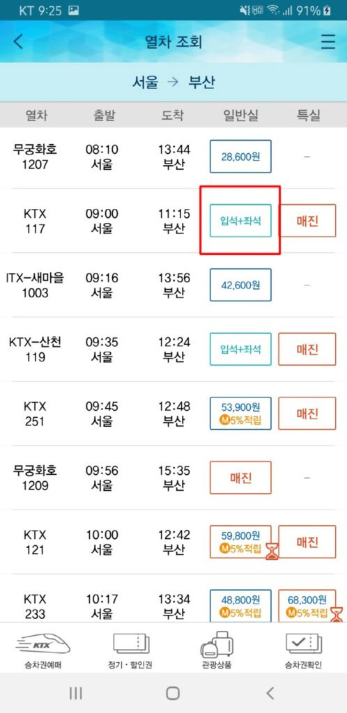 2. (ktx 입석 좌석 꿀팁) 매진일 경우 출발역에서 목적지 역의 중간역 바꿔보기.