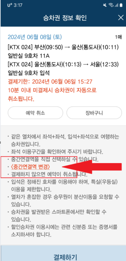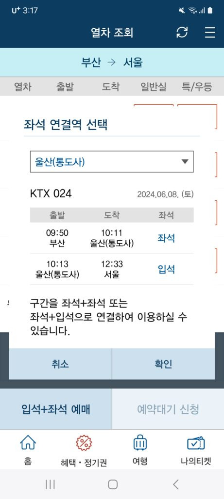 1. 중간연결 역을 바꿔서 입석을 좌석으로 바꾸기 (KTX 입석 + 좌석 옵션 있을 경우 만)