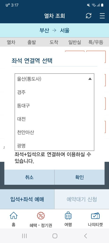 아래 옵션에서 비록 부산에서 울산까지는 입석이지만, 부산에서 다른 중간 역을 선택할 경우 좌석으로 바뀌는 경우가 있습니다, 꼭 시도해보시기 바랍니다.