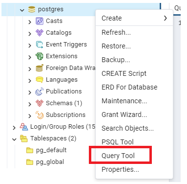 데이터베이스 이름 마우스 우 클릭 후 하단의 Query Tool 를 클릭합니다.