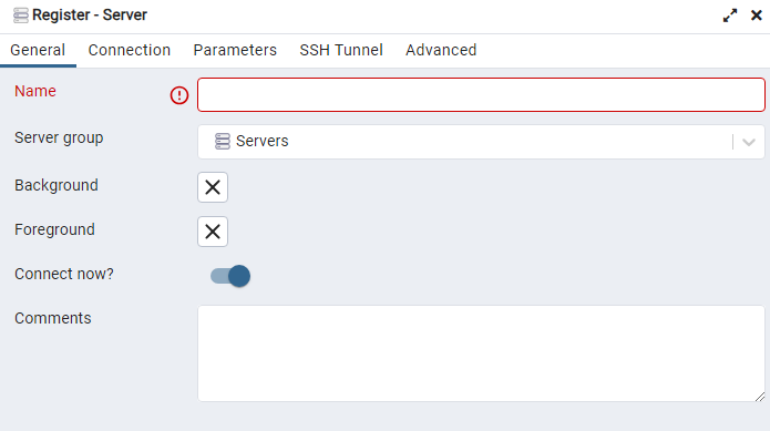 위와 같은 화면이 뜨면 약 1분 후 pgadmin 화면이 나타납니다. 왼쪽 화면의 "Servers"를 클릭 후 PostgreSQL 를 설치 한 서버의 정보를 입력하여 데이터베이스를 연결합니다. ♥ 데이터베이스 서버 이름을 임의로 지정하고 Connection 부분에서 설치 한 psql의 서버 정보, 데이터베이스 정보를 입력합니다.